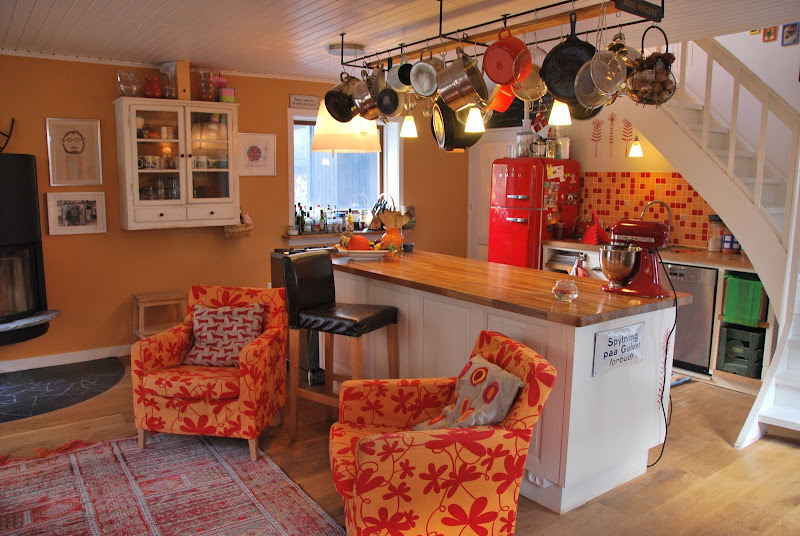 Well. If that's not picture after picture of love at first sight, I don't know what is. That fridge! That stove! That drawer/counter/island unit! The open space so that you can have company while you cook! I love red (when I get a KitchenAid mixer, it shall be red; and if I hadn't gotten my Cuisinart as a hand-me-down, it would be red as well) and that fridge has got me a one-way ticket to join Paolo e Francesca in the second circle.